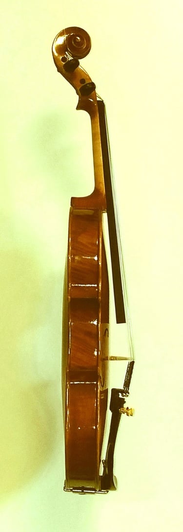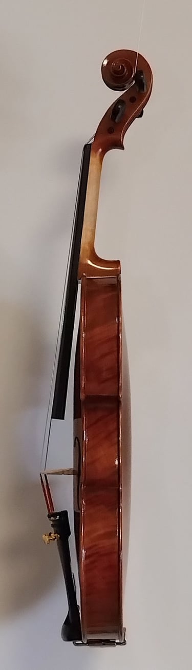 Do budowy tego instrumentu posłużyły dwa gatunki drewna: świerkowe (płyta górna) oraz jaworowe ( pozostałe elementy skrzypiec). Drewno jaworowe posiada ładny rysunek drewna, który pięknie się prezentuje pod spirytusowym lakierem barwy złoto borązowej. Lakier wykończony jest w półpołysku. Akcesoria skrzypiec wykonane są z bukszpanu i palisandru(podbródek) a struny to komplet Thomastic Alphayu. Skrzypce dają bardzo nośny i wyrównany dźwięk.Wraz ze skrzypcami w cenie mieści się nowy futerał oraz smyczek. Cena za komplet 9000zł. Zapraszam